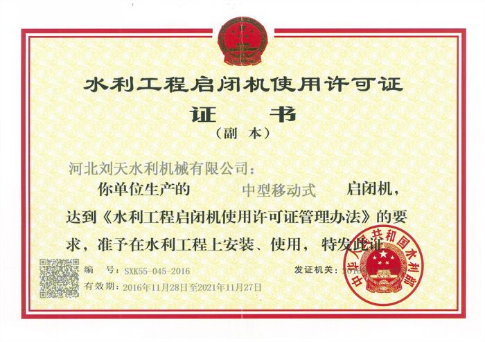 啟閉機使用許可證-中型固定卷揚式啟閉機
